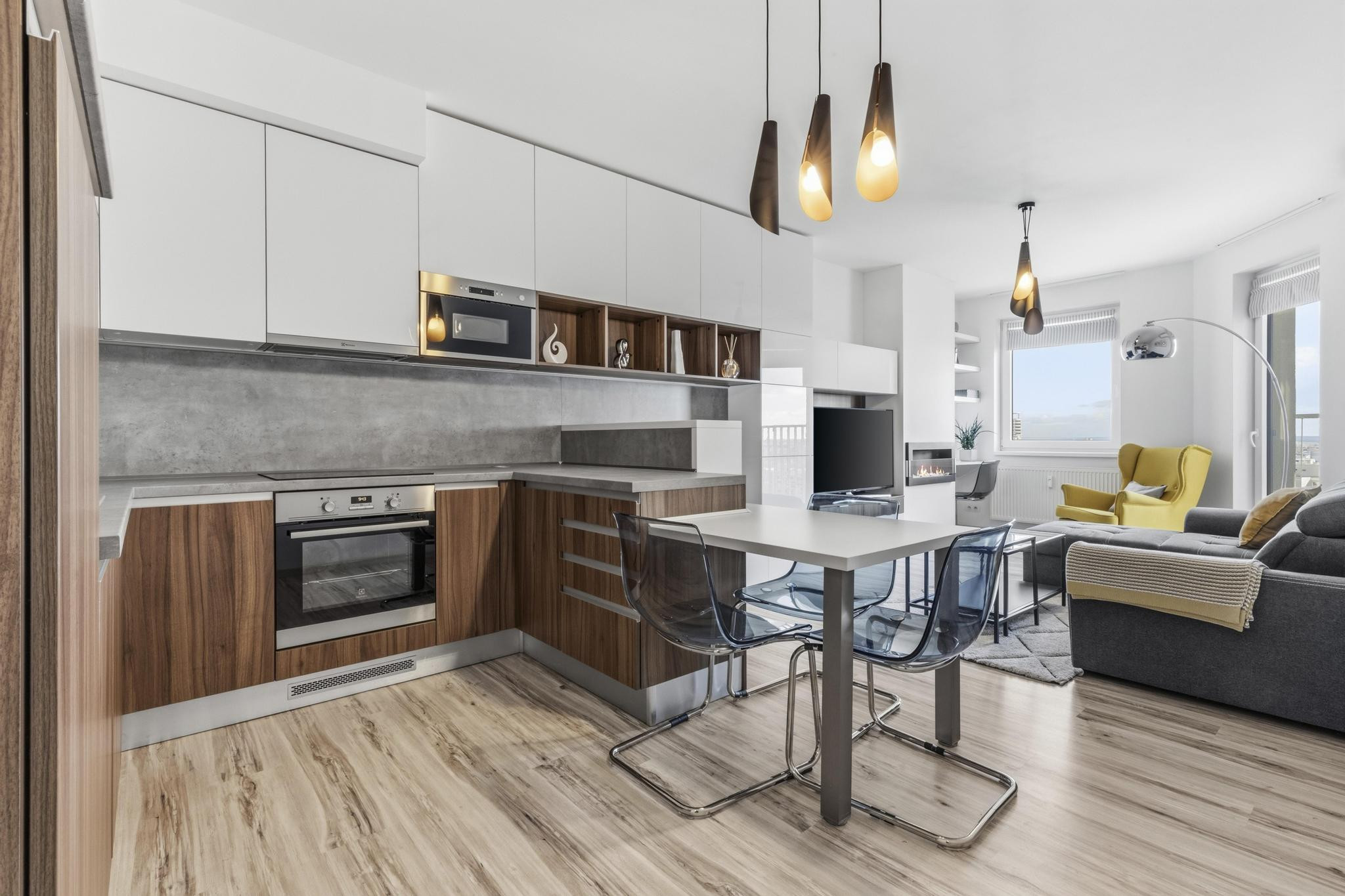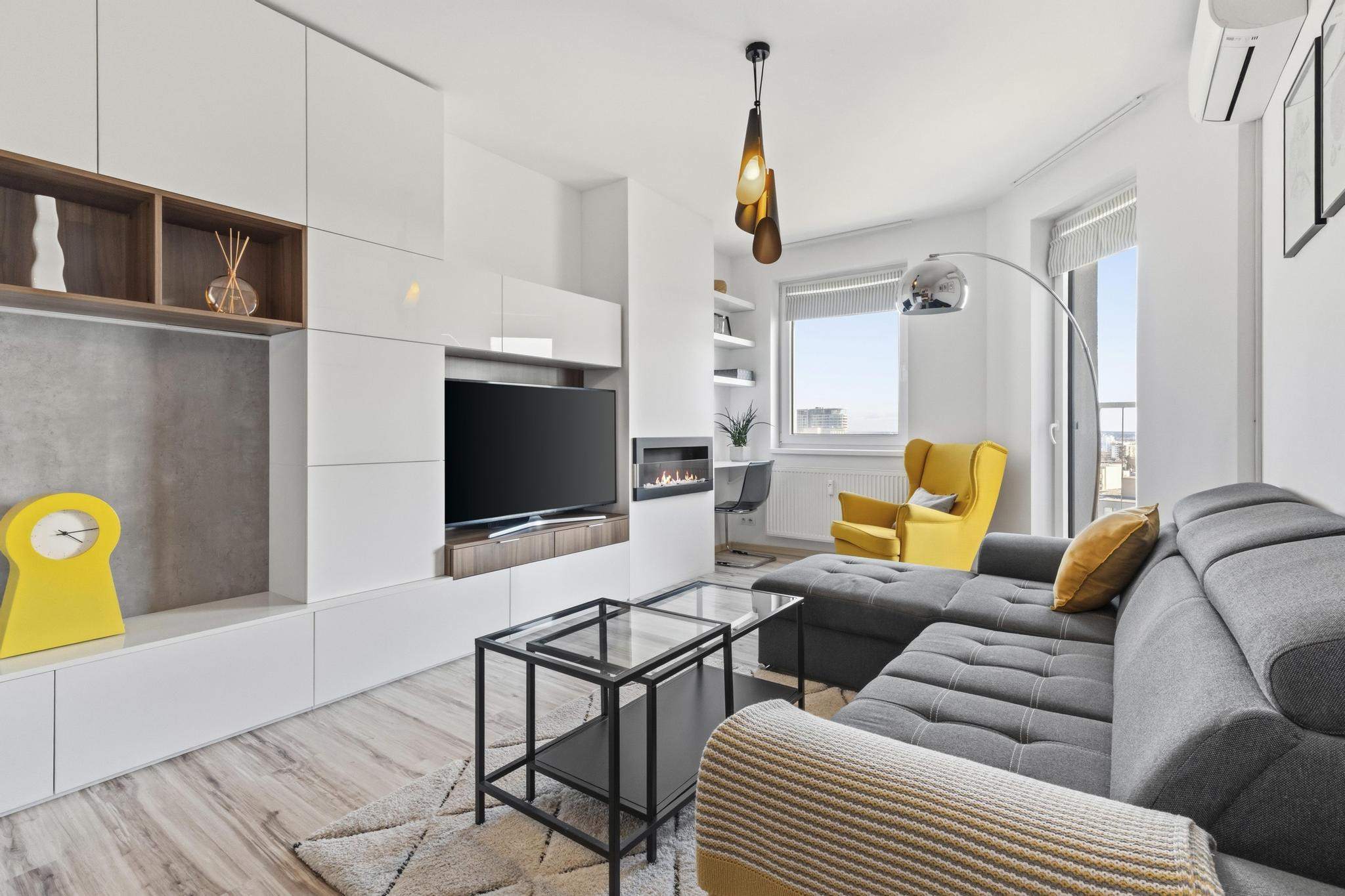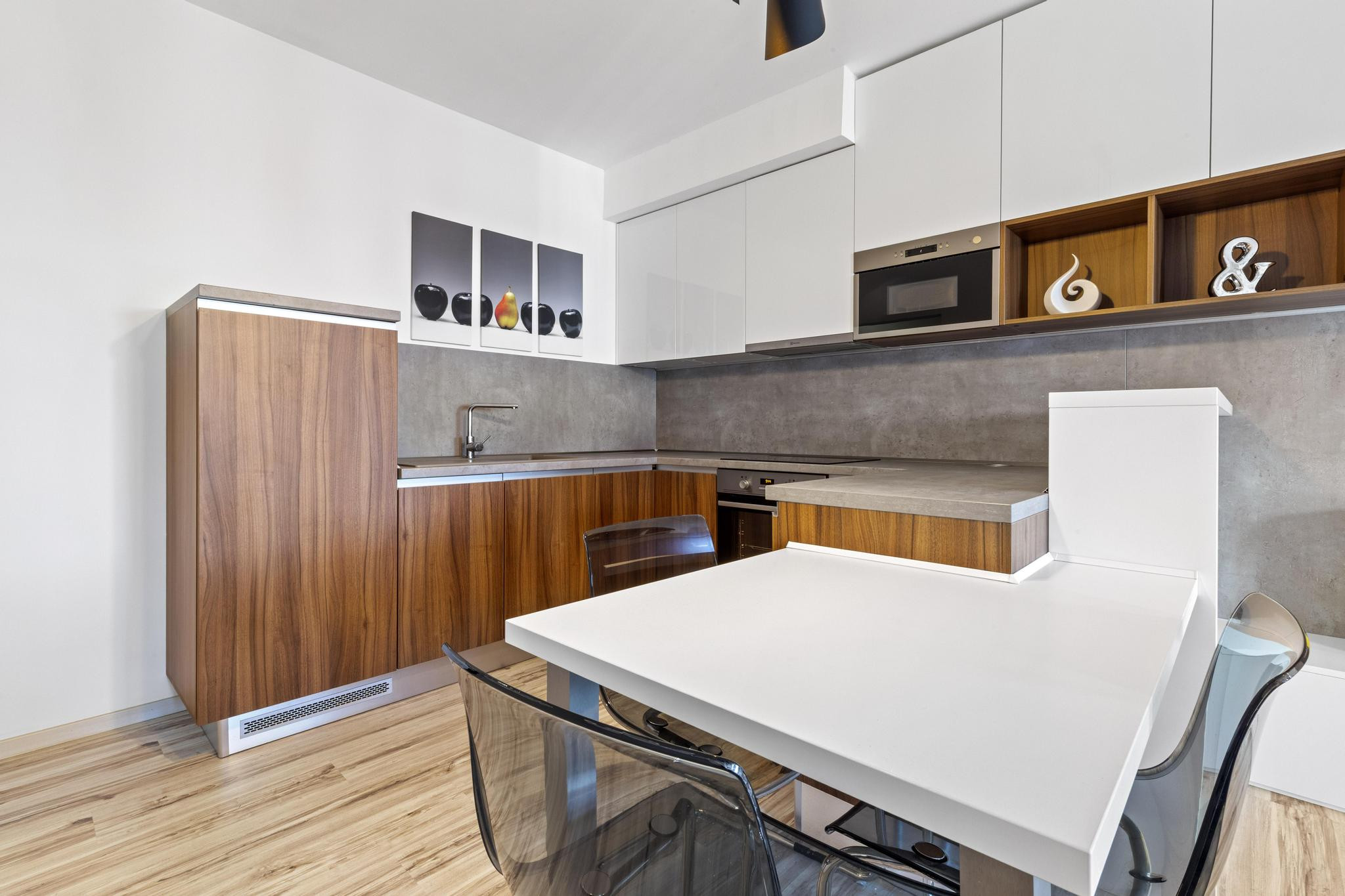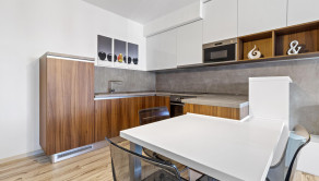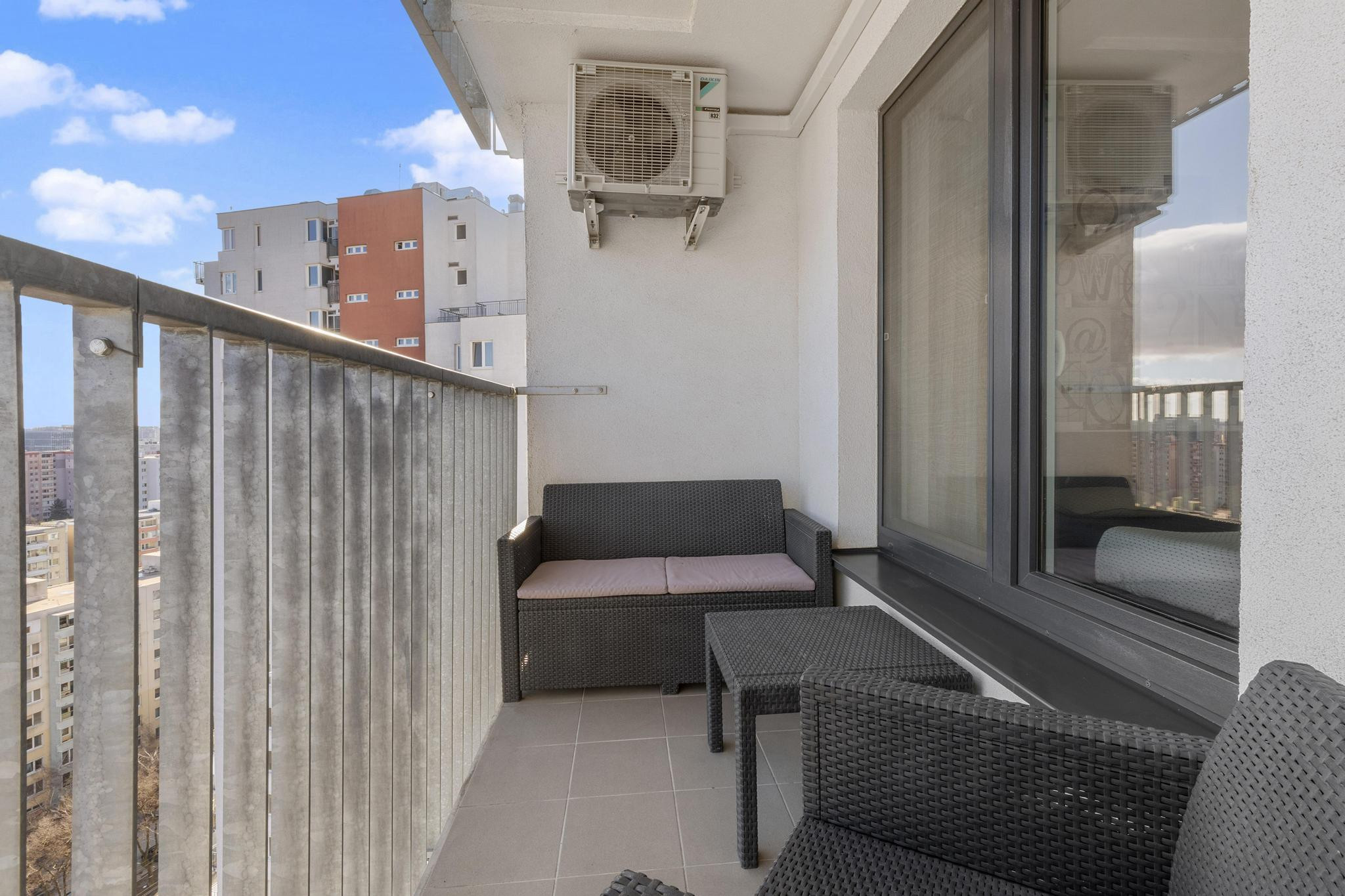 V spálni sa nachádza manželská posteľ a šatníková skriňa, okno smeruje na loggiu s výhľadom na Bratislavu. V druhej obytnej miestnosti sa nachádza plnohodnotná kuchynská linka na mieru, vybavená okrem iného indukčnou varnou doskou, umývačkou riadu, vstavanou mikrovlnnou rúrou a chladničkou, zároveň je tu dostatok úložného priestoru, ktorý plynule v rovnakom dizajne prechádza aj do obývacej časti. Kuchynská časť je elegantne oddelená barom a jedálenským stolom. V obývacej časti nájdeme sedaciu súpravu, vstavaný úložný priestor na mieru, TV, konferenčný stolík, oddelený pracovný stôl pri okne, dizajnové osvetlenie, biokrb. Miestnosť je klimatizovaná, kvalitná klimatizácia zn. Daikin. Z obývačky sa vychádza na loggiu o výmere 4,28m² s vonkajším sedením a výhľadom na panorámu Bratislavy a Malých Karpát. V kúpeľni nájdeme vaňu s rozkladacou sprchovou zástenou, WC, umývadlo so skrinkou, zrkadlo s osvetlením, skrinku a práčku. V byte sa nachádza aj samostatná komora s praktickým úložným priestorom. Vstupná hala prepája vstup do všetkých miestností.