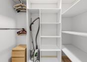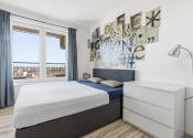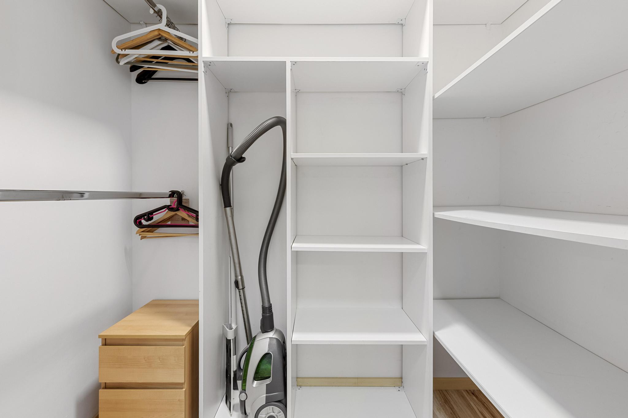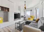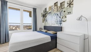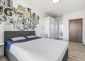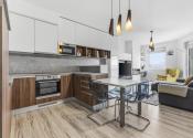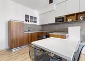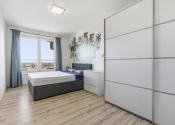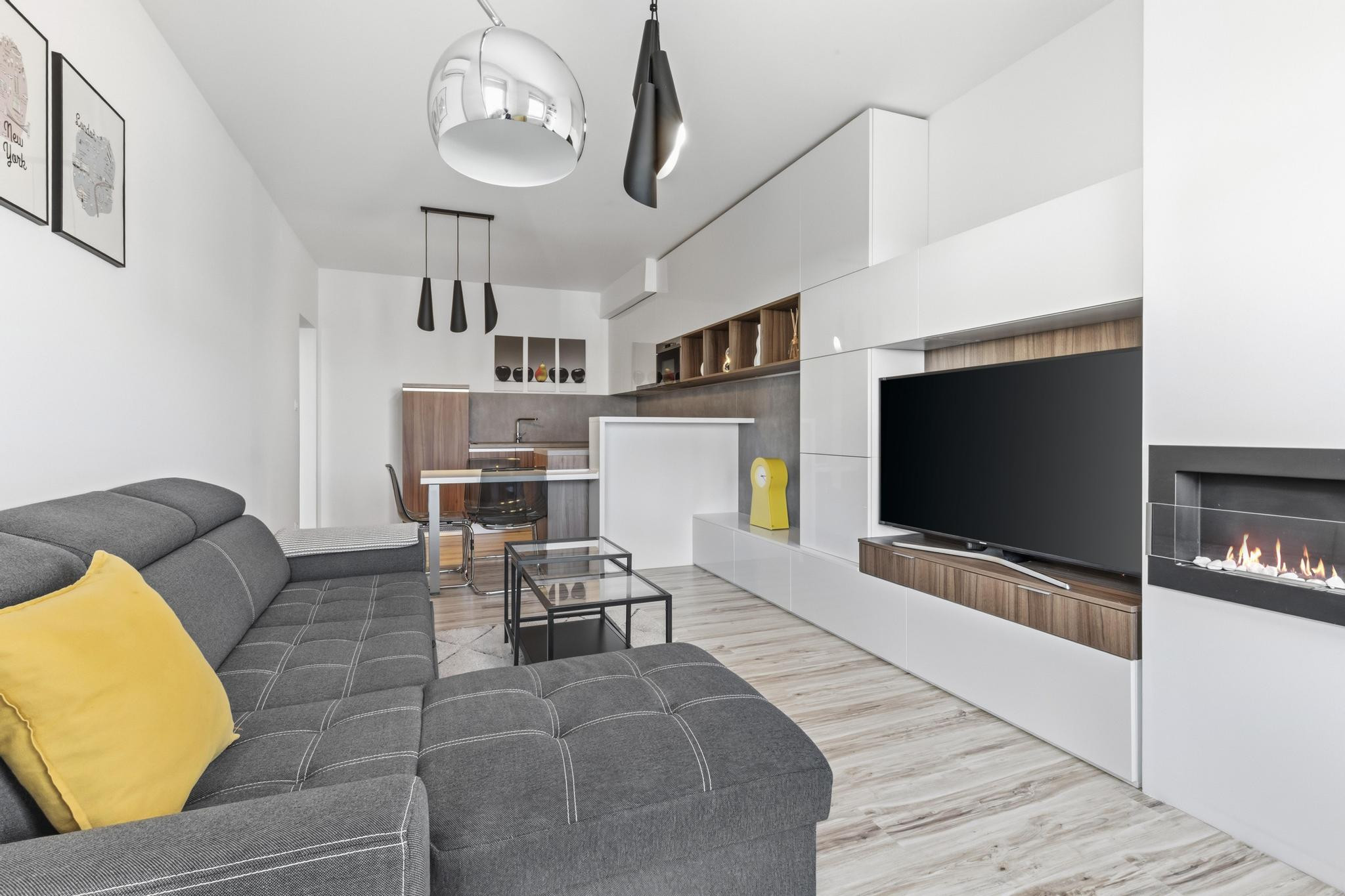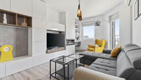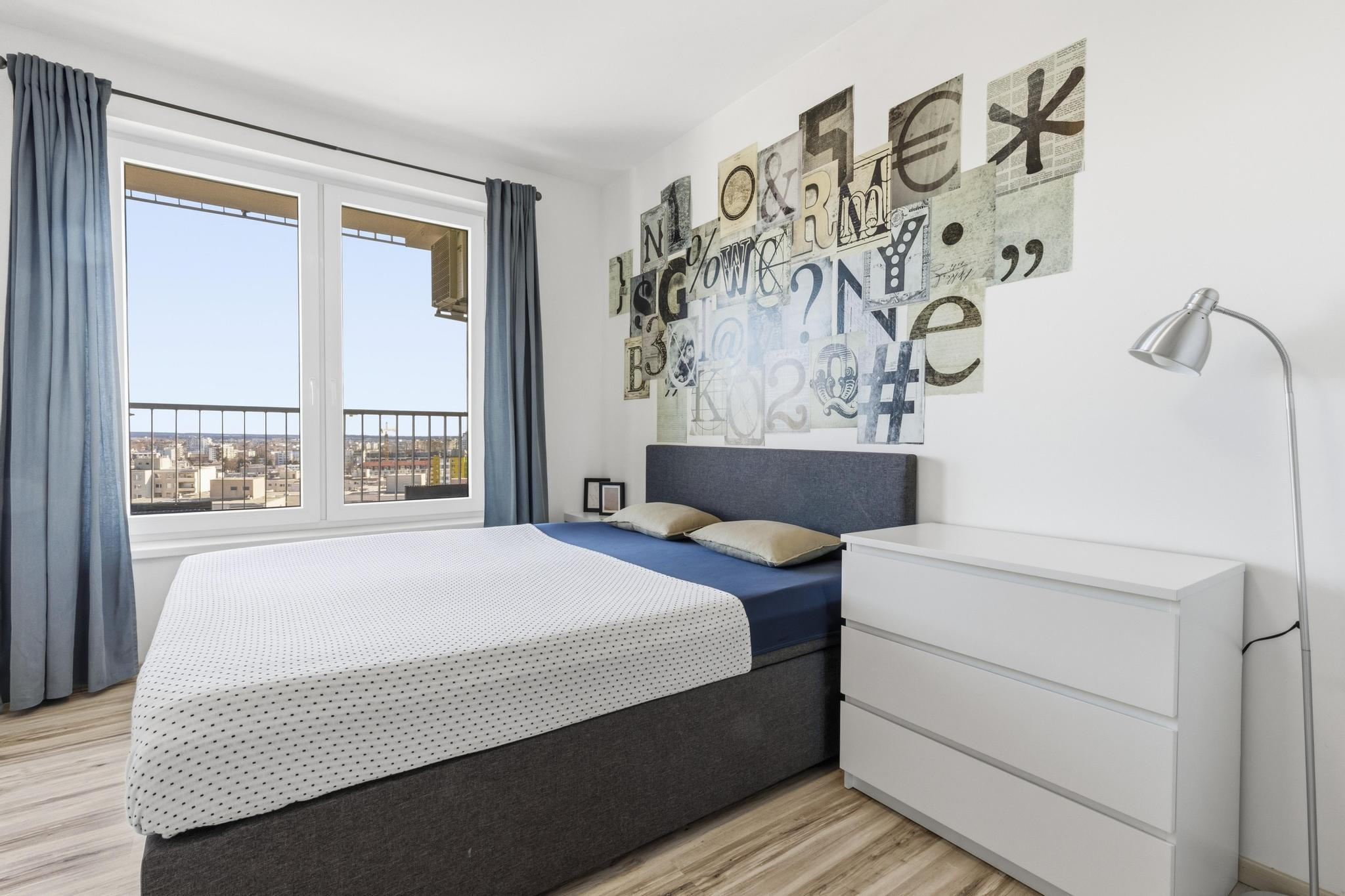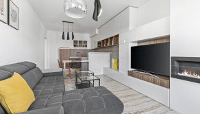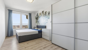 V spálni sa nachádza manželská posteľ a šatníková skriňa, okno smeruje na loggiu s výhľadom na Bratislavu. V druhej obytnej miestnosti sa nachádza plnohodnotná kuchynská linka na mieru, vybavená okrem iného indukčnou varnou doskou, umývačkou riadu, vstavanou mikrovlnnou rúrou a chladničkou, zároveň je tu dostatok úložného priestoru, ktorý plynule v rovnakom dizajne prechádza aj do obývacej časti. Kuchynská časť je elegantne oddelená barom a jedálenským stolom. V obývacej časti nájdeme sedaciu súpravu, vstavaný úložný priestor na mieru, TV, konferenčný stolík, oddelený pracovný stôl pri okne, dizajnové osvetlenie, biokrb. Miestnosť je klimatizovaná, kvalitná klimatizácia zn. Daikin. Z obývačky sa vychádza na loggiu o výmere 4,28m² s vonkajším sedením a výhľadom na panorámu Bratislavy a Malých Karpát. V kúpeľni nájdeme vaňu s rozkladacou sprchovou zástenou, WC, umývadlo so skrinkou, zrkadlo s osvetlením, skrinku a práčku. V byte sa nachádza aj samostatná komora s praktickým úložným priestorom. Vstupná hala prepája vstup do všetkých miestností.